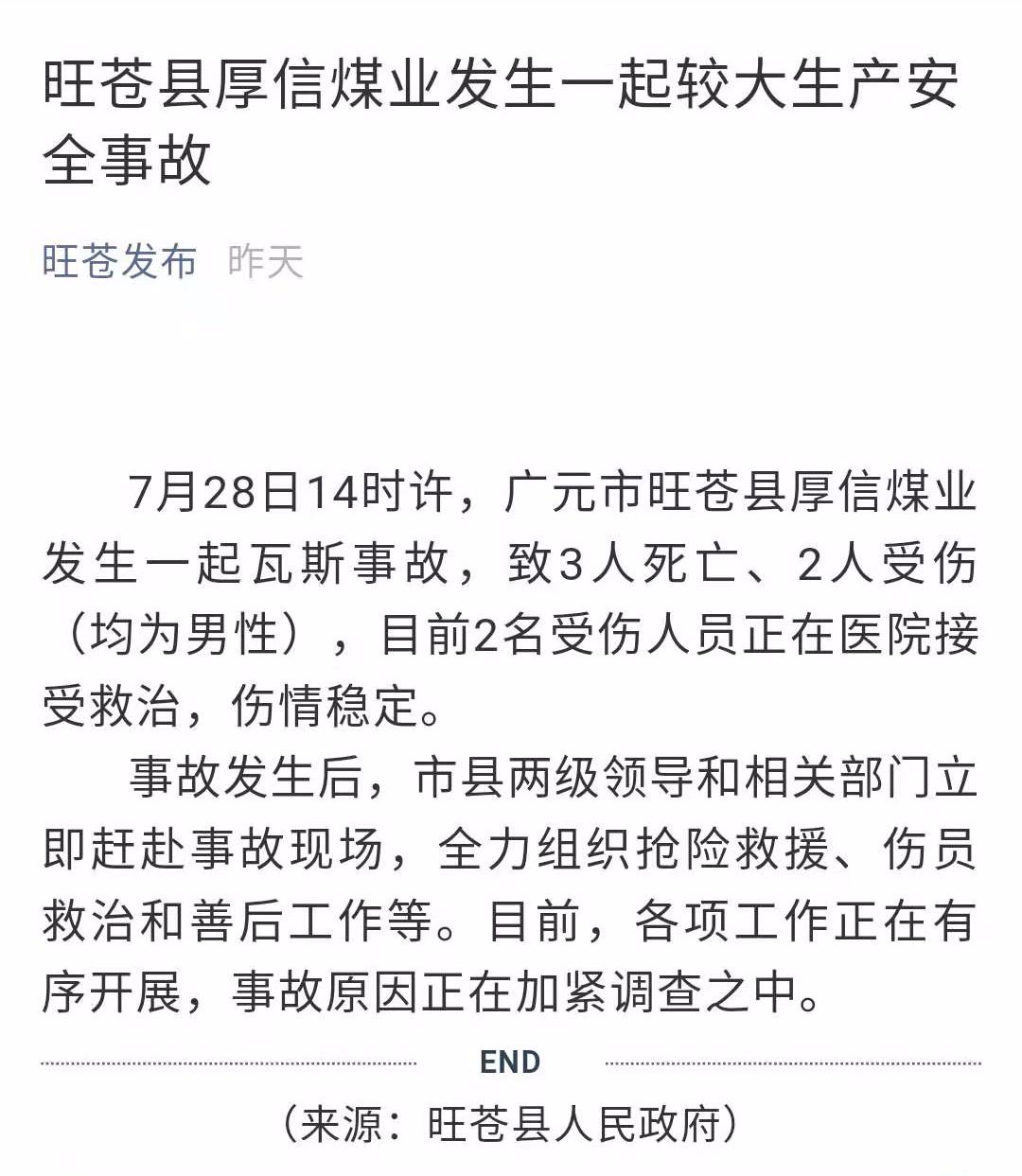 據(jù)四川省旺蒼縣委員會(huì)宣傳部微信公眾號消息,7月28日14時(shí)許,廣元市旺蒼縣厚信煤業(yè)發(fā)生一起瓦斯事故,致3人死亡、2人受傷(均為男性),目前2名受傷人員正在醫(yī)院接受救治,傷情穩(wěn)定。