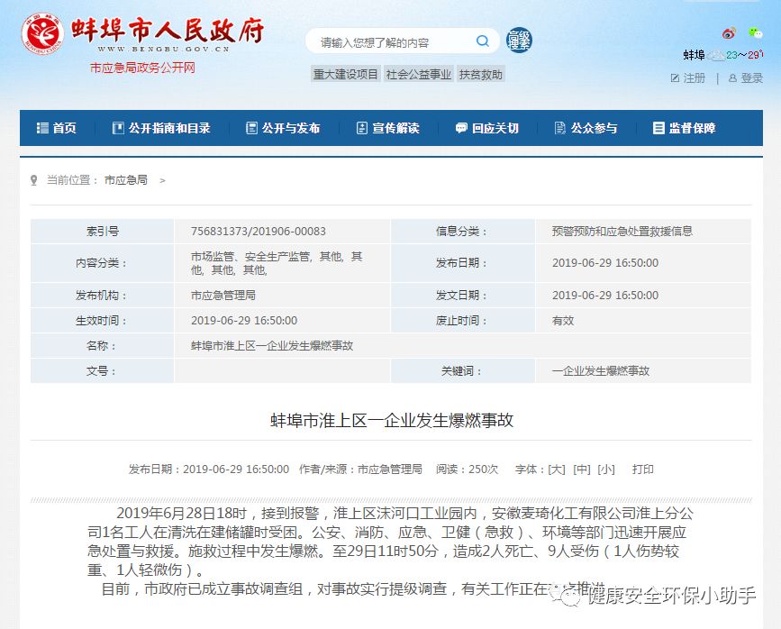 蚌埠市人民政府官網(wǎng)消息,6月28日18時(shí),接到報(bào)警,淮上區(qū)沫河口工業(yè)園內(nèi),安徽麥琦化工有限公司淮上分公司1名工人在清洗在建儲(chǔ)罐時(shí)受困。公安、消防、應(yīng)急、衛(wèi)健(急救)、環(huán)境等部門(mén)迅速開(kāi)展應(yīng)急處置與救援。施救過(guò)程中發(fā)生爆燃。至29日11時(shí)50分,造成2人死亡、9人受傷(1人傷勢(shì)較重、1人輕微傷)。