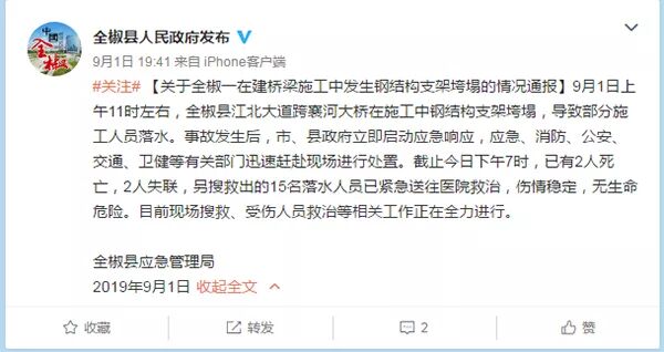 安徽滁州市全椒縣人民政府官方微博9月1日晚發(fā)布關(guān)于“全椒一在建橋梁施工中發(fā)生鋼結(jié)構(gòu)支架垮塌”的情況通報(bào)。