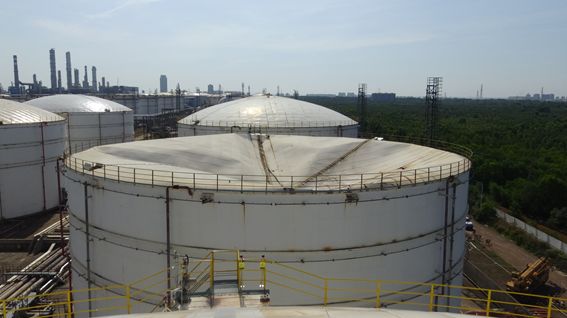 T-4110罐南部的綠化帶中停放有一輛車牌號(hào)為瓊E03592的吊車,吊車車頭朝東南方向,起重臂沒(méi)有打開,吊車的西部地面上有一堆長(zhǎng)方形的鋼板。T-4110罐體東北部貼有一塊銘牌,銘牌顯示該罐建造于2006年3月,公稱直徑為38000mm,高度17820mm,罐壁材質(zhì)Q235B等信息。銘牌的東南側(cè)為罐體外壁的樓梯起點(diǎn),樓梯往東南方向旋轉(zhuǎn)至罐體頂部東側(cè)邊緣。罐體頂部有拱頂,拱頂表面鋼板接縫部位銹蝕顯現(xiàn)較重。拱頂中部塌陷,拱頂西部往拱頂中心方向和拱頂南部往拱頂中心方向有兩處比較大的鋼板接縫斷裂形成的空區(qū)。罐體底端的東南部和西北部各有一個(gè)圓形的檢修人孔,從檢修人孔排出的氣體有明顯的汽油氣味。通過(guò)檢修人孔觀察罐體內(nèi)部,發(fā)現(xiàn)罐體內(nèi)底部倒塌有大量的鐵板、工字鋼等材料,工字鋼斷裂痕跡新鮮。