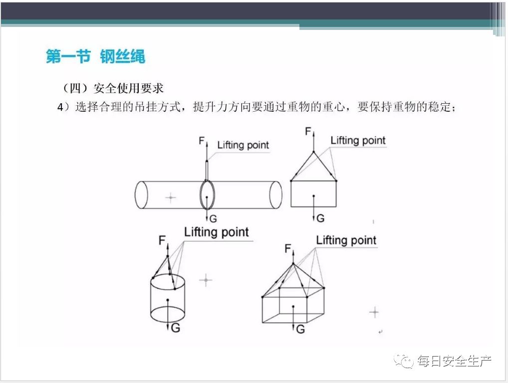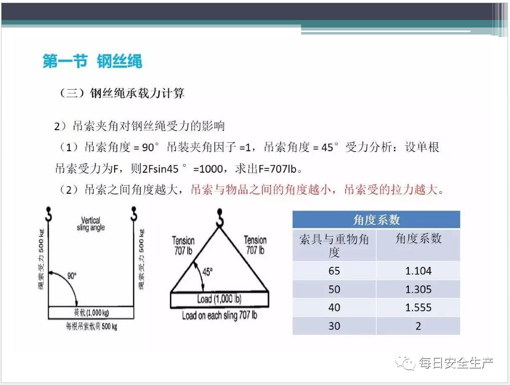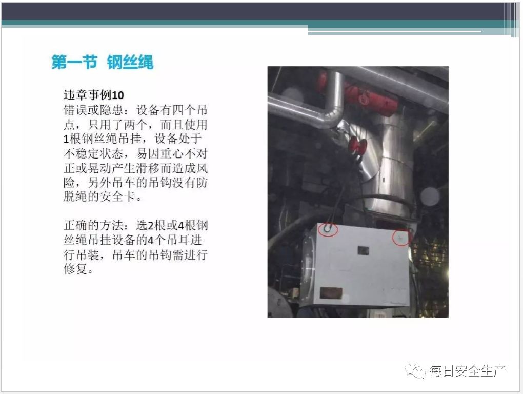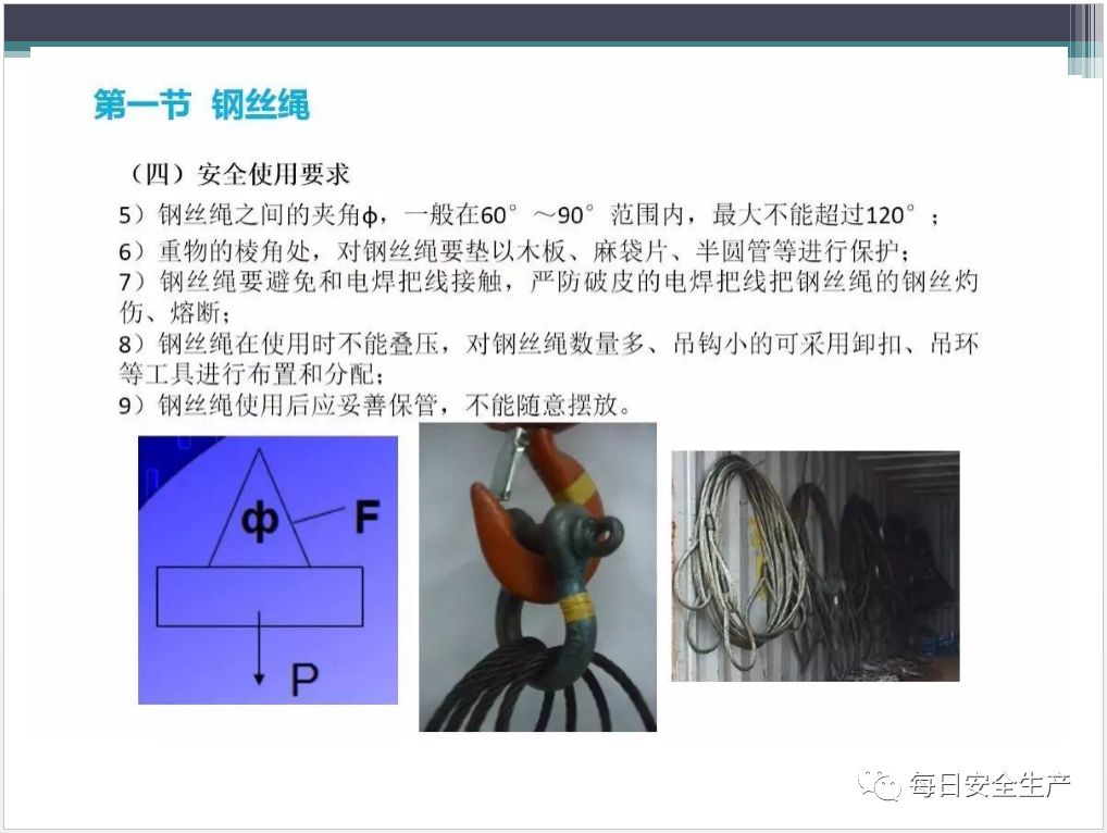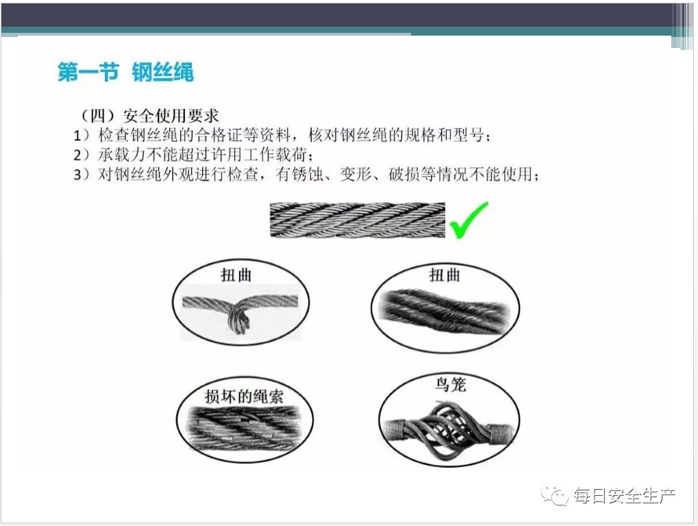 造成吊裝繩破斷的主要原因多為吊裝角度太大>120度,使吊裝繩抗拉強度超過極限值而拉斷;吊裝鋼絲繩品種規(guī)格選擇不當,或仍使用已達到報廢標準的鋼絲繩捆綁吊裝重物造成吊裝繩破斷;吊裝繩與重物之間接觸處無墊片等保護措施,因而造成棱角割斷鋼絲繩而出現(xiàn)吊裝繩破斷事故。