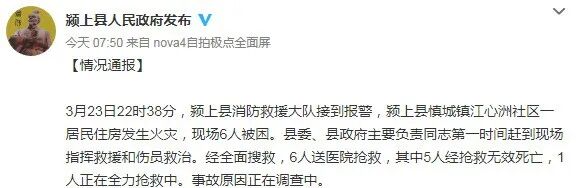 今早,安徽省阜陽(yáng)市潁上縣人民政府發(fā)布通報(bào):3月23日22時(shí)38分,潁上縣消防救援大隊(duì)接到報(bào)警,潁上縣慎城鎮(zhèn)江心洲社區(qū)一居民住房發(fā)生火災(zāi),現(xiàn)場(chǎng)6人被困。縣委、縣政府主要負(fù)責(zé)同志第一時(shí)間趕到現(xiàn)場(chǎng)指揮救援和傷員救治。經(jīng)全面搜救,6人送醫(yī)院搶救,其中5人經(jīng)搶救無(wú)效死亡,1人正在全力搶救中。