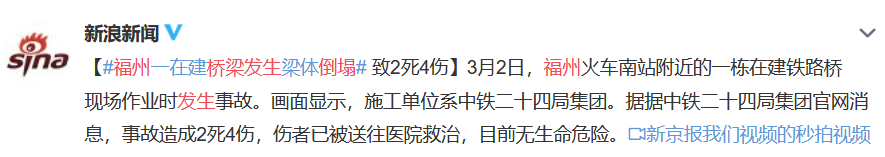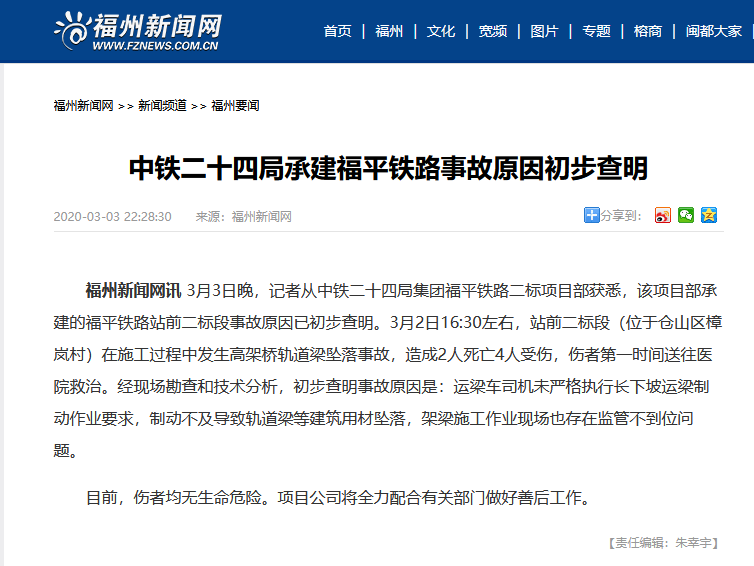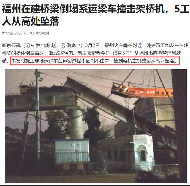 事故原因查明: 從福州市應急管理局獲悉,事發(fā)時施工現場運梁車在運梁過程中因剎不住車,撞到架橋主機致梁從高處墜落。 3月2日下午5點左右,福建福州火車南站附近的一處建筑工地,發(fā)生在建橋梁的梁體倒塌。倒塌梁體壓倒一個活動板房。致2死4傷,畫面顯示,施工單位系中鐵二十四局集團。