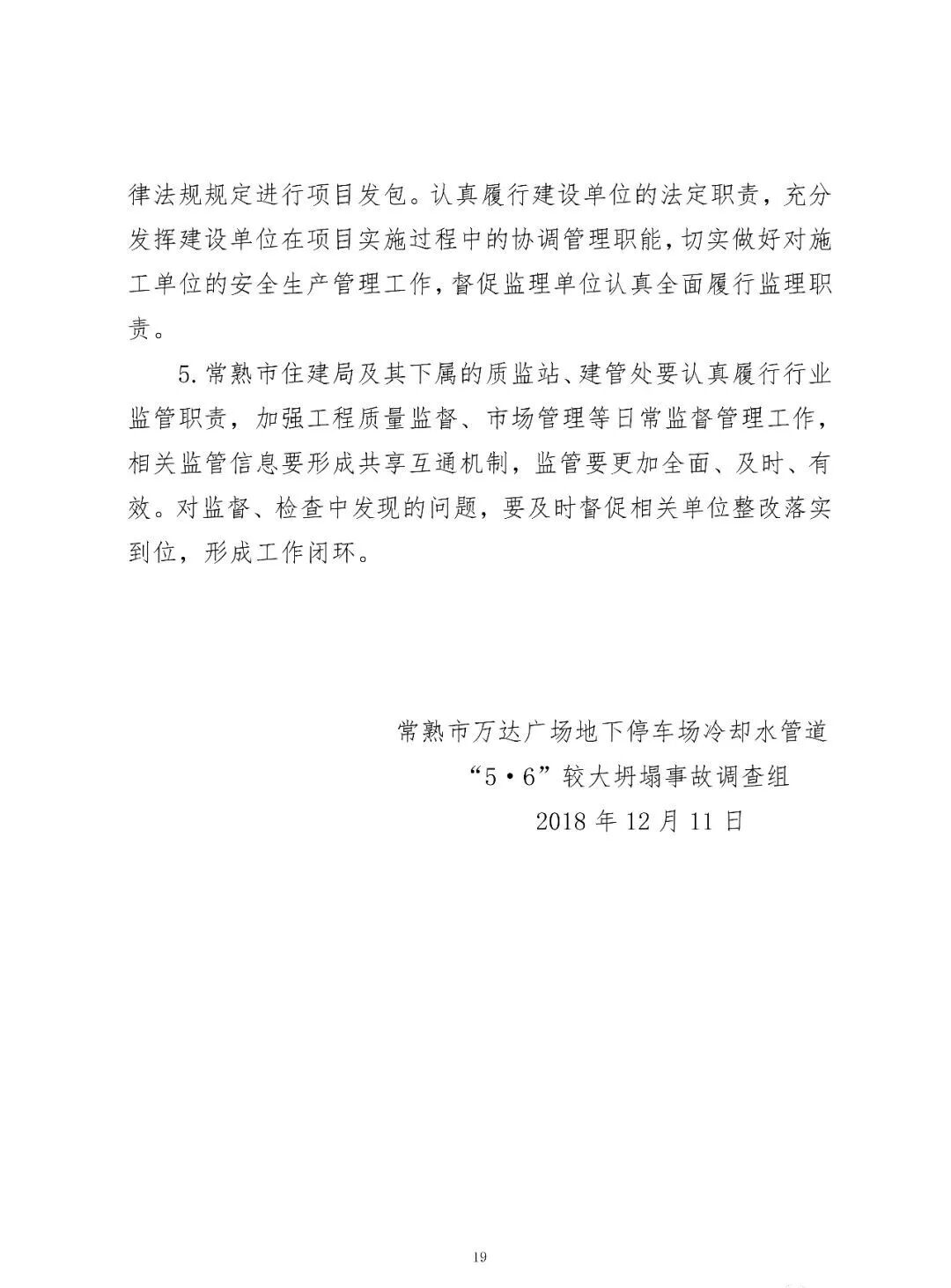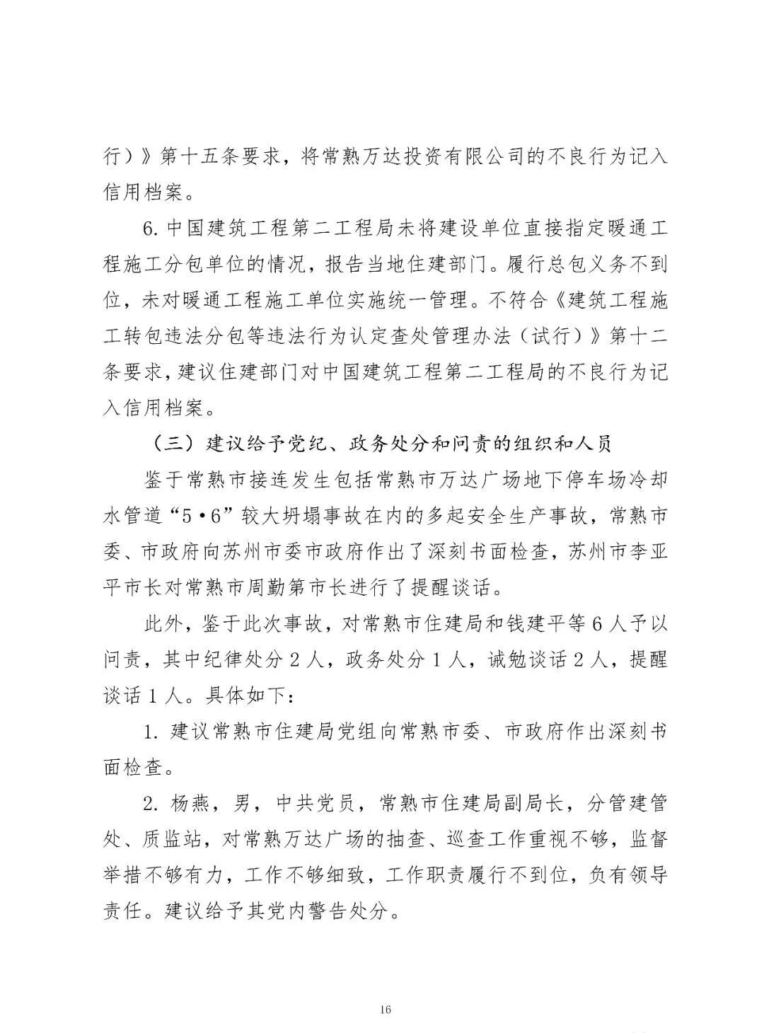 鑒于常熟市接連發(fā)生包括常熟市萬達(dá)廣場地下停車場冷卻水管道“5·6”較大坍塌事故在內(nèi)的多起安全生產(chǎn)事故,常熟市委、市政府向蘇州市委市政府作出了深刻書面檢查,蘇州市李亞平市長對常熟市周勤第市長進(jìn)行了提醒談話。此外,鑒于此次事故,對常熟市住建局和錢建平等6人予以問責(zé),其中紀(jì)律處分2人,政務(wù)處分1人,誡勉談話2人,提醒談話1人。具體如下: