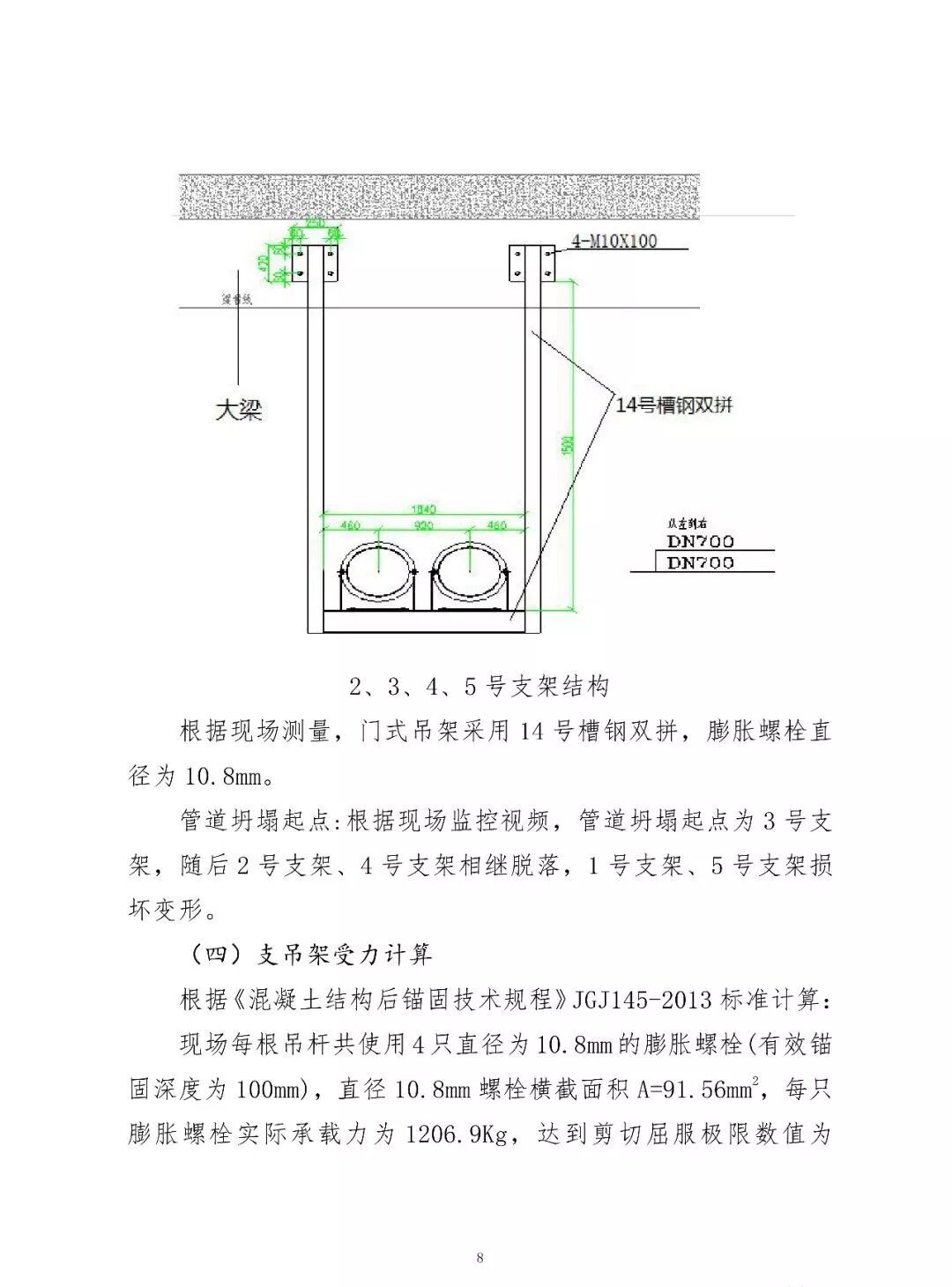 1.江蘇啟安建設(shè)工程有限公司提供了支吊架膨脹螺栓計(jì)算書,但計(jì)算書上無企業(yè)相關(guān)人員簽字,未經(jīng)監(jiān)理單位審核同意,未報(bào)施工總包單位,未經(jīng)設(shè)計(jì)單位審定;計(jì)算書認(rèn)為支吊架應(yīng)采用直徑為12mm 的膨脹螺栓,事故管段實(shí)際采用直徑為10.8mm的膨脹螺栓(根據(jù)《通風(fēng)與空調(diào)工程施工規(guī)范》規(guī)定,當(dāng)管徑大于300mm 時(shí),應(yīng)采用直徑為20mm的膨脹螺栓,冷卻管道直徑實(shí)際為700mm);未經(jīng)設(shè)計(jì)單位書面同意,擅自將支吊架鋼面板上的2個(gè)膨脹螺栓頭(共6個(gè)膨脹螺栓)切割至與鋼板面齊平;另有2個(gè)螺栓未與大梁作有效連接。