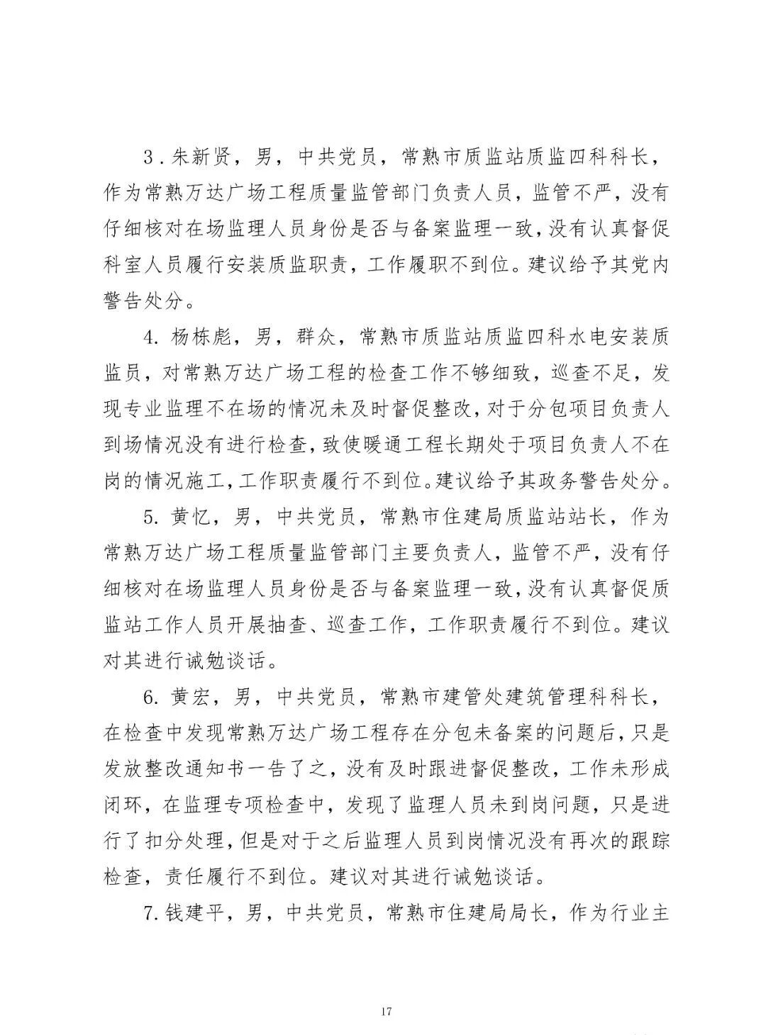 7.錢建平,男,中共黨員,常熟市住建局局長,作為行業(yè)主管部門主要負(fù)責(zé)人,對質(zhì)量監(jiān)督、市場管理等日常監(jiān)督管理不到位,負(fù)有領(lǐng)導(dǎo)責(zé)任。建議對其進(jìn)行提醒談話。