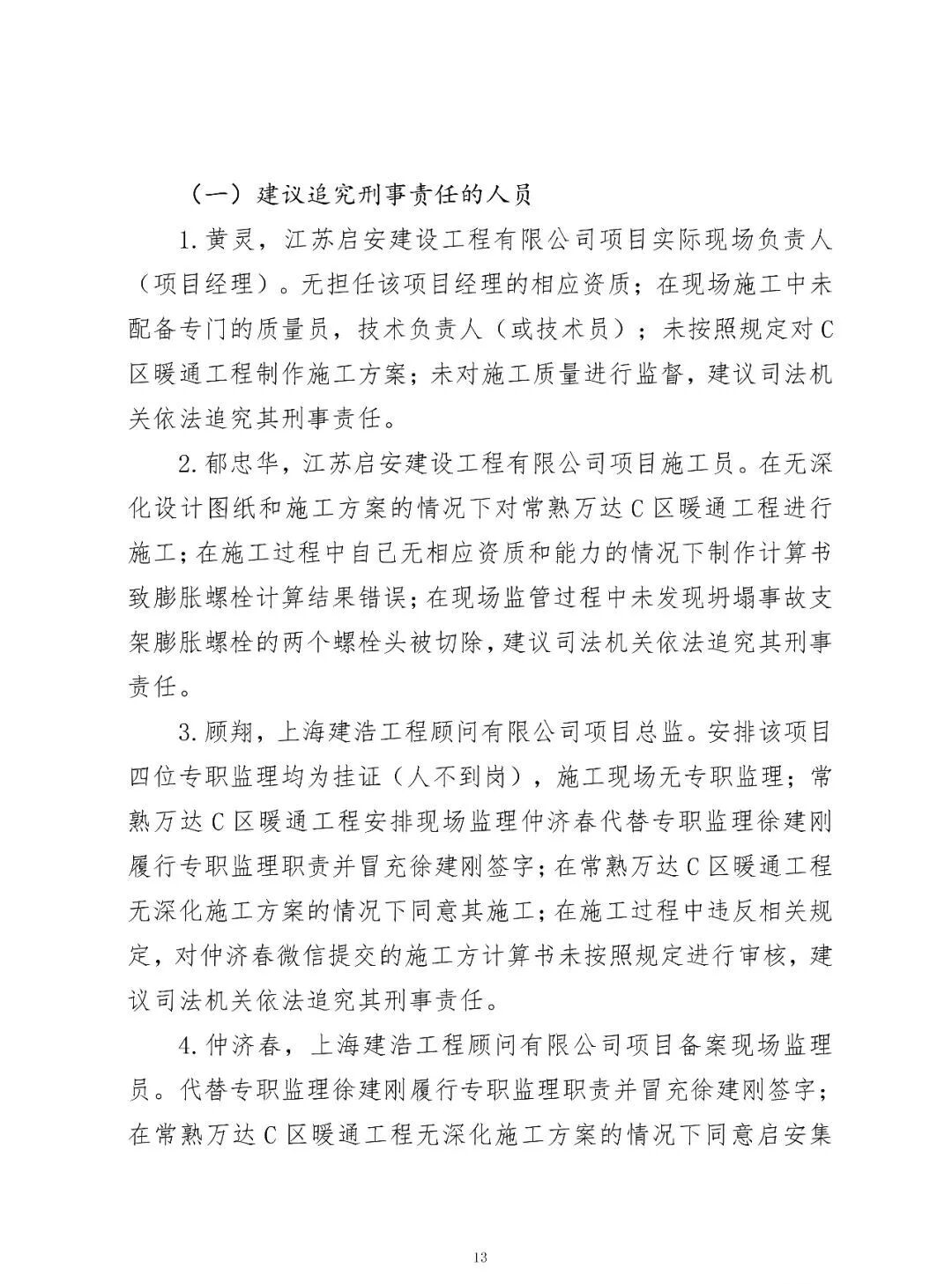 4.仲濟(jì)春,上海建浩工程顧問有限公司項(xiàng)目備案現(xiàn)場監(jiān)理員。代替專職監(jiān)理徐建剛履行專職監(jiān)理職責(zé)并冒充徐建剛簽字;在常熟萬達(dá)C區(qū)暖通工程無深化施工方案的情況下同意啟安集團(tuán)七分公司施工;在施工過程中違反相關(guān)規(guī)定,對啟安施工員郁忠華微信提交的計(jì)算書未按規(guī)定進(jìn)行審核;對工程材料未按照規(guī)定進(jìn)行驗(yàn)收,在現(xiàn)場監(jiān)管和驗(yàn)收過程中未發(fā)現(xiàn)坍塌事故支架膨脹螺栓的兩個(gè)螺栓頭被切除,建議司法機(jī)關(guān)依法追究其刑事責(zé)任。