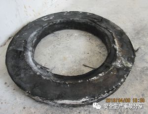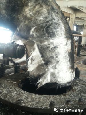 4.加裝了鋼制法蘭活套,導(dǎo)致無法發(fā)現(xiàn)法蘭頸部疲勞老化的隱患。久泰公司由于部分石墨冷卻器入口處的玻璃鋼管法蘭面密封效果不好,為此專門訂做了一個鋼制的活套法蘭,套住石墨冷卻器入口玻璃鋼彎頭法蘭,由于法蘭頸部被活套遮擋,無法對法蘭頸部進行隱患檢查,造成玻璃鋼管道因疲勞老化而斷裂,導(dǎo)致事故的發(fā)生。