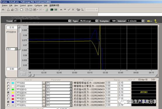 2018年4月2日9:00時E2反應(yīng)釜通氣開車,此次共開啟了14臺反應(yīng)釜(F1/A2/C2/F2未開),至12時20分轉(zhuǎn)入正常生產(chǎn),運行正常。至4月3日凌晨發(fā)生事故,事故前E2反應(yīng)釜運行溫度140.9℃,運行壓力0.0748MPa。