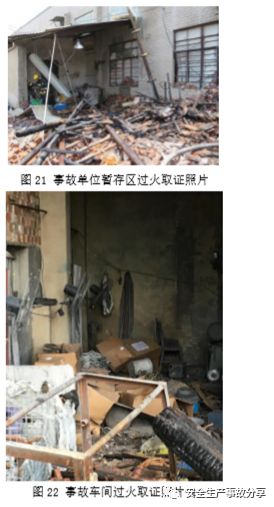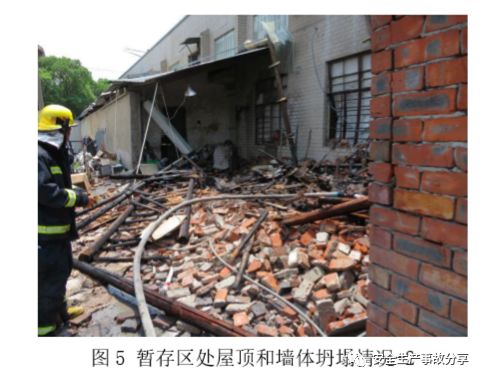 3、事故現(xiàn)場情況(1)事故類型定性取證情況事故現(xiàn)場勘察情況顯示,此次事故既有爆炸的痕跡,也有燃燒的痕跡。A、爆炸痕跡的取證事故現(xiàn)場多處存在爆炸的痕跡。爆炸痕跡取證舉例如下:①事故單位暫存區(qū)的外墻和屋頂坍塌(參見圖 4、圖 5);