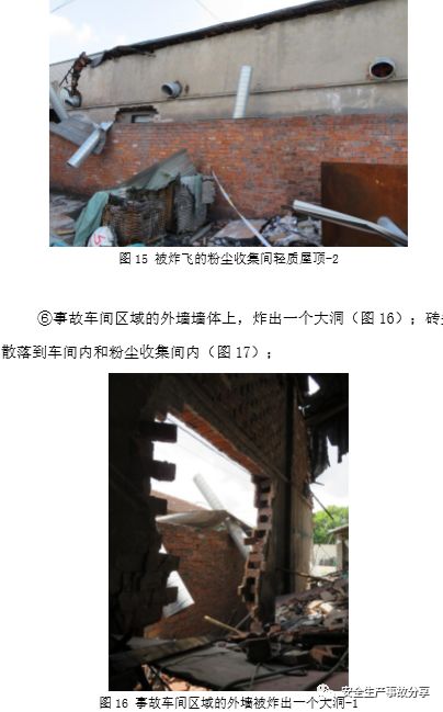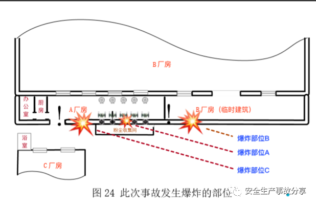 事故現(xiàn)場勘察情況顯示,此次事故既有爆炸的痕跡,也有燃燒的痕跡。根據(jù)現(xiàn)場勘察情況,此次事故中發(fā)生爆炸的部位主要有三處:一處位于生產(chǎn)區(qū)域內(nèi),在自北向南第二、第三兩臺(tái)打磨機(jī)之間的外墻處;第二處位于臨近生產(chǎn)區(qū)域的暫存區(qū)外墻處;第三處位于生產(chǎn)區(qū)域北面隔壁相連的廠房臨時(shí)建筑外墻處。(詳見《事故原因技術(shù)分析報(bào)告》)