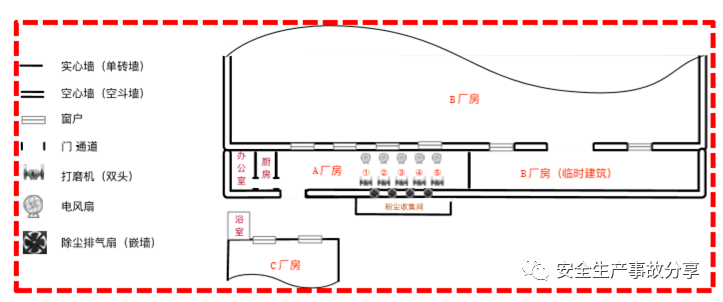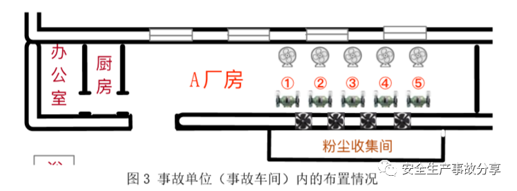 圖 3 事故單位(事故車間)內(nèi)的布置情況主要情況是:(1)事故單位設(shè)置在依附于 B 廠房搭建的建筑物(報(bào)告代稱 A廠房)內(nèi),設(shè)置有輕質(zhì)屋頂;在其外墻外,搭建有粉塵收集間,其墻體由單磚砌成,其上覆蓋有輕質(zhì)屋頂,屋頂設(shè)置有排氣管道;(2)A 廠房內(nèi),由圖示位置,自左而右,分別設(shè)置有辦公室、廚房、物料暫存區(qū)或緩沖空間或人員臨時(shí)駐留區(qū)域(下稱暫存區(qū)),以及生產(chǎn)區(qū)域(或稱生產(chǎn)車間);廚房間和辦公室,均設(shè)有單磚墻的分隔,其上開設(shè)有門;在暫存區(qū)和鄰近廚房一邊外墻上,開設(shè)有進(jìn)出人與貨的通道,通道上設(shè)置有卷簾門;(3)生產(chǎn)區(qū)域,設(shè)置有 5 臺(tái)雙頭打磨機(jī)(即每臺(tái)打磨機(jī)可同時(shí)供兩人進(jìn)行打磨作業(yè)),打磨機(jī)緊貼外墻設(shè)置(為方便敘述,報(bào)告按照由外向里的順序,對(duì)打磨機(jī)進(jìn)行編號(hào),①~⑤號(hào)打磨機(jī)的位置,參見圖 3)(4)在兩臺(tái)打磨機(jī)之間對(duì)應(yīng)的外墻上,貼近地面位置,安裝有除塵用的排氣扇;在打磨機(jī)對(duì)應(yīng)的外墻上端位置,另安裝有三臺(tái)排氣扇;·BCA B嘉定區(qū)滬宜公路 5958 號(hào)其他爆炸事故事故原因技術(shù)分析報(bào)告華東理工大學(xué)安全工程咨詢中心 9(5)在每一臺(tái)打磨機(jī)(作業(yè)人員的)后方,對(duì)應(yīng)設(shè)置有電風(fēng)扇;(6)在暫存區(qū),放置有一臺(tái)空壓機(jī)(用于吹掃粉塵);(7)生產(chǎn)區(qū)域的底端,砌有空心與實(shí)體相混的磚墻。(與 B廠房臨時(shí)建筑相隔離)。
