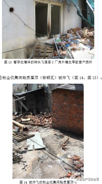 圖 13 暫存處墻體的磚頭飛落至 C 廠房外墻處導(dǎo)致窗戶損壞⑤粉塵收集間輕質(zhì)屋頂(彩鋼瓦)被炸飛(圖 14、圖 15);圖 14 被炸飛的粉塵收集間輕質(zhì)屋頂-1嘉定區(qū)滬宜公路 5958 號(hào)其他爆炸事故事故原因技術(shù)分析報(bào)告華東理工大學(xué)安全工程咨詢中心 15圖 15 被炸飛的粉塵收集間輕質(zhì)屋頂-2⑥事故車間區(qū)域的外墻墻體上,炸出一個(gè)大洞(圖 16);磚頭散落到車間內(nèi)和粉塵收集間內(nèi)(圖 17);