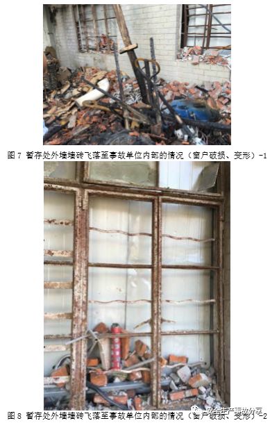 向內(nèi)散落的磚頭,導(dǎo)致 B 廠房窗戶變形、玻璃損毀(圖 19);