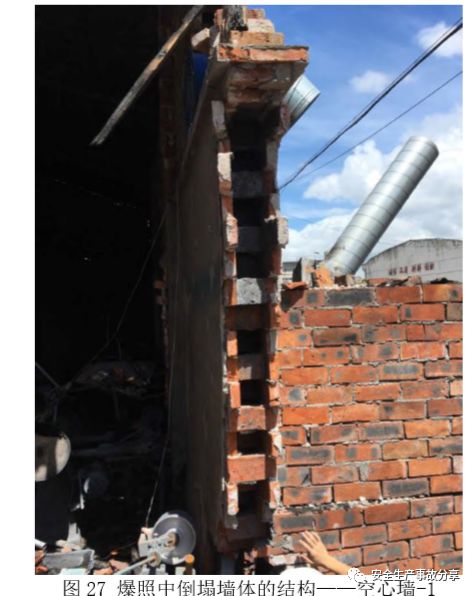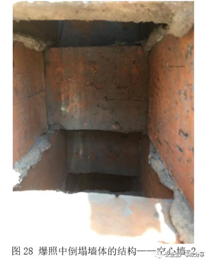 圖 26 空心墻的結(jié)構(gòu)示意圖嘉定區(qū)滬宜公路 5958 號(hào)其他爆炸事故事故原因技術(shù)分析報(bào)告華東理工大學(xué)安全工程咨詢中心 22事故現(xiàn)場爆炸墻體的構(gòu)造情況,參見圖 27 和圖 28。圖 27 爆照中倒塌墻體的結(jié)構(gòu)——空心墻-1