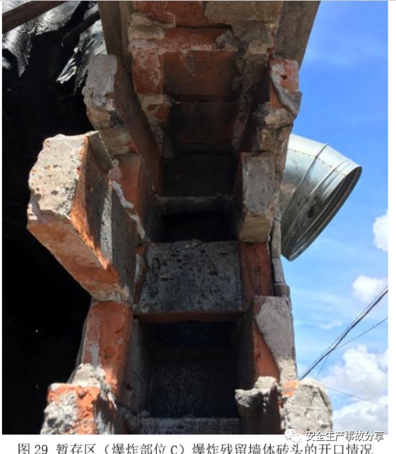 圖 28 爆照中倒塌墻體的結(jié)構(gòu)——空心墻-2嘉定區(qū)滬宜公路 5958 號(hào)其他爆炸事故事故原因技術(shù)分析報(bào)告華東理工大學(xué)安全工程咨詢中心 23③爆炸倒塌的墻體,爆炸出的磚頭,向兩邊飛散。參見上文有關(guān)圖片及描述。④爆炸后殘留的墻體,空心墻的雙層磚,大多呈現(xiàn)開放式、喇叭口式的開口——即里外兩層磚分別向外口突出。參見上文的圖16 和圖 17,以及此處提供的三張圖片,分別是爆炸部位 C、爆炸部位 A 和爆炸部位 B 處殘留墻體,磚頭開口的情況(圖 29~圖 31)圖 29 暫存區(qū)(爆炸部位 C)爆炸殘留墻體磚頭的開口情況嘉定區(qū)滬宜公路 5958 號(hào)其他爆炸事故事故原因技術(shù)分析報(bào)告華東理工大學(xué)安全工程咨詢中心 24圖 30 事故車間內(nèi)(爆炸部位 A)爆炸殘留墻體磚頭的開口情況(注:此圖旨在顯示外層磚向外突出的情況,結(jié)合圖 16、圖 17,可看出里層轉(zhuǎn)向里突出的情況)圖 31 B 廠房臨時(shí)建筑(爆炸部位 B)爆炸殘留墻體磚頭的開口情況-1嘉定區(qū)滬宜公路 5958 號(hào)其他爆炸事故事故原因技術(shù)分析報(bào)告華東理工大學(xué)安全工程咨詢中心 25圖 32 B 廠房臨時(shí)建筑(爆炸部位 B)爆炸殘留墻體磚頭的開口情況-2⑤由爆炸后的殘留墻體還可以看出,靠近墻體上層部位的磚頭,大多呈現(xiàn)灼燒或過火的痕跡。參見圖 29~圖 31 以及此處的圖33。圖 33 爆炸殘留墻體上部磚頭呈現(xiàn)過火的情況嘉定區(qū)滬宜公路 5958 號(hào)其他爆炸事故事故原因技術(shù)分析報(bào)告華東理工大學(xué)安全工程咨詢中心 264、受傷員工訪談此次調(diào)查工作中,調(diào)查人員對(duì)三名受傷較輕的員工,進(jìn)行了問詢和訪談。訪談獲得的重要信息如下:(1)此次事故既有火災(zāi),也有爆炸。(2)爆炸發(fā)生前,曾經(jīng)發(fā)生過一個(gè)小火災(zāi)。(3)小火災(zāi)發(fā)生在③號(hào)與④號(hào)打磨機(jī)之間下端的排風(fēng)扇位置(即爆炸部位 A 處),為除塵排風(fēng)扇的電氣火災(zāi)(可能的情形包括:短路形成的高溫、電弧形成的高溫、電氣火花、電氣表面的高溫引燃其表面的可燃物等)。(4)小火災(zāi)發(fā)生后,在場人員立即切斷了電源,并立即用水進(jìn)行了滅火。(5)爆炸事故是在小火災(zāi)滅火后不久發(fā)生的。(6)幾名燒傷嚴(yán)重的人員,就是在此時(shí)受傷的。(7)他們加工/打磨的工件是自行車把手等配件。(8)工件處理中,有時(shí)會(huì)用到堿。采用堿液浸泡。(9)受傷較輕人員,均是在看到火災(zāi)被控制后停下休息的;老板常江等受傷嚴(yán)重的人員,均是在處理殘余火星時(shí),突然發(fā)生爆炸,造成嚴(yán)重傷害的。5、目擊證人訪談事故原因調(diào)查人員,還對(duì) B 廠房內(nèi)的工作人員進(jìn)行了訪談。嘉定區(qū)滬宜公路 5958 號(hào)其他爆炸事故事故原因技術(shù)分析報(bào)告華東理工大學(xué)安全工程咨詢中心 27訪談結(jié)果中的重要信息如下:(1)B 廠房臨時(shí)建筑的外墻,是此次事故中倒塌的。(2)B 廠房外墻上的窗戶,是此次事故中震碎的。(3)聽到了爆炸聲。(4)爆炸聲,不是短促的“嘭”,而是有一定持續(xù)長度的“嘭——”。五、事故原因的推斷依據(jù)調(diào)查與取證結(jié)果,針對(duì)此次事故的原因,報(bào)告作如下推斷:起先的電氣火災(zāi),造成了高溫環(huán)境;用水滅火的作業(yè),導(dǎo)致了高溫?zé)崴纳?;高溫?zé)崴c打磨作業(yè)產(chǎn)生的鋁粉或鋁合金粉末發(fā)生反應(yīng),產(chǎn)生氫氣;氫氣在空心墻內(nèi)聚集、擴(kuò)散,并在空心墻內(nèi)(尤其是偏上部位)富集;氫氣與空氣在空心墻內(nèi)形成可燃可爆氣體,并在局部墻段靠上部位達(dá)到爆炸威力巨大的爆炸極限濃度(下稱高濃區(qū));當(dāng)靠近電氣火災(zāi)引發(fā)點(diǎn)附近的空心墻體內(nèi)部的可燃?xì)怏w濃度達(dá)到可燃極限后(低濃區(qū)),被電氣高溫或現(xiàn)場余火引燃;火焰在空心墻內(nèi)傳播,當(dāng)火焰?zhèn)鞑ブ粮邼鈪^(qū)時(shí),引發(fā)空心墻爆炸;由于空心墻內(nèi)部結(jié)構(gòu)的原因,氫氣在符合條件的區(qū)域形成高濃區(qū),因而導(dǎo)致了三處墻體的爆炸。事故車間內(nèi)的爆炸點(diǎn),是第一爆炸點(diǎn)。爆炸形成的超壓,致使空心墻墻體內(nèi)部的燃爆混合氣體噴出,其在室內(nèi)或或擴(kuò)散范圍內(nèi)燃燒,導(dǎo)致人員嚴(yán)重?zé)齻???招膲?nèi)引燃的火焰,迅速沿左右兩個(gè)方向在墻嘉定區(qū)滬宜公路 5958 號(hào)其他爆炸事故事故原因技術(shù)分析報(bào)告華東理工大學(xué)安全工程咨詢中心 28體內(nèi)蔓延、擴(kuò)散,直至在左右兩個(gè)方向上引發(fā)墻體爆炸。由于三次連續(xù)爆炸的間隔時(shí)間很短,聲波重疊,人耳無法聽到清晰的三次爆炸聲。六、事故原因推斷分析的過程1、粉塵爆炸的排除此次事故中,可燃性金屬粉塵雖然是關(guān)鍵的肇事物之一,在爆炸引發(fā)的火災(zāi)環(huán)節(jié)中,金屬粉塵也有可能參與了燃燒,但爆炸事故的形成,并不是由粉塵直接引起的,或者說,此次爆炸事故,不是一次金屬粉塵爆炸事故。做出如此判斷的依據(jù),主要有下列幾點(diǎn):(1)爆炸現(xiàn)場的墻壁、工件等的表面,未見有大量粉塵的附著。(2)依據(jù)生產(chǎn)設(shè)施情況,粉塵收集間應(yīng)該是粉塵數(shù)量最大的地方,如