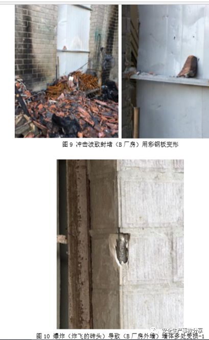 圖 7 暫存處外墻墻磚飛落至事故單位內(nèi)部的情況(窗戶破損、變形)-1圖 8 暫存處外墻墻磚飛落至事故單位內(nèi)部的情況(窗戶破損、變形)-2嘉定區(qū)滬宜公路 5958 號(hào)其他爆炸事故事故原因技術(shù)分析報(bào)告華東理工大學(xué)安全工程咨詢中心 12圖 9 沖擊波致封堵(B 廠房)用彩鋼板變形圖 10 爆炸(炸飛的磚頭)導(dǎo)致(B 廠房外墻)墻體多處受損-1嘉定區(qū)滬宜公路 5958 號(hào)其他爆炸事故事故原因技術(shù)分析報(bào)告華東理工大學(xué)安全工程咨詢中心 13