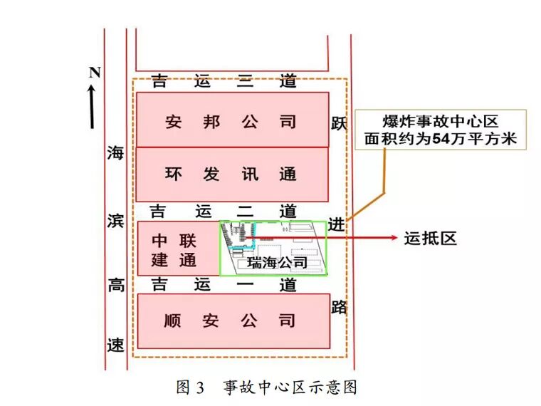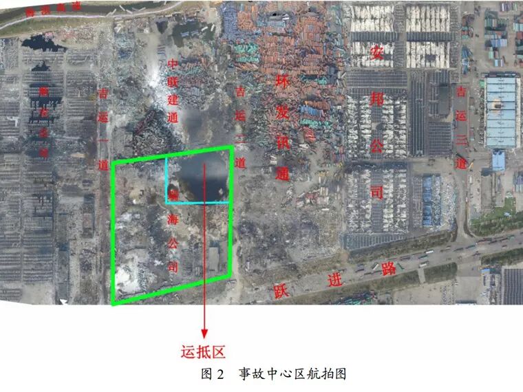 事故現(xiàn)場(chǎng)按受損程度,分為事故中心區(qū)(航拍圖見圖2、示意圖見圖3)、爆炸沖擊波波及區(qū)(示意圖見圖4)。事故中心區(qū)為此次事故中受損最嚴(yán)重區(qū)域,該區(qū)域東至躍進(jìn)路、西至海濱高速、南至順安倉儲(chǔ)有限公司、北至吉運(yùn)三道,面積約為54萬平方米。兩次爆炸分別形成一個(gè)直徑15米、深1.1米的月牙形小爆坑和一個(gè)直徑97米、深2.7米的圓形大爆坑。以大爆坑為爆炸中心,150米范圍內(nèi)的建筑被摧毀,東側(cè)的瑞海公司綜合樓和南側(cè)的中聯(lián)建通公司辦公樓只剩下鋼筋混凝土框架;堆場(chǎng)內(nèi)大量普通集裝箱和罐式集裝箱被掀翻、解體、炸飛,形成由南至北的3座巨大堆垛,一個(gè)罐式集裝箱被拋進(jìn)中聯(lián)建通公司辦公樓4層房間內(nèi),多個(gè)集裝箱被拋到該建筑樓頂;參與救援的消防車、警車和位于爆炸中心南側(cè)的吉運(yùn)一道和北側(cè)吉運(yùn)三道附近的順安倉儲(chǔ)有限公司、安邦國際貿(mào)易有限公司儲(chǔ)存的7641輛商品汽車和現(xiàn)場(chǎng)滅火的30輛消防車在事故中全部損毀,鄰近中心區(qū)的貴龍實(shí)業(yè)、新東物流、港灣物流等公司的4787輛汽車受損。