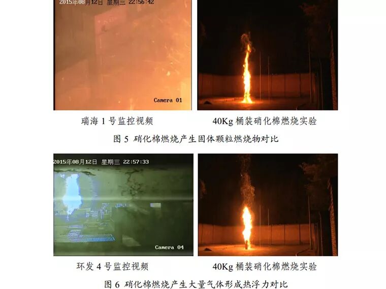 2. 篩查最初著火物質(zhì)。事故調(diào)查組通過調(diào)取天津海關(guān)H2010通關(guān)管理系統(tǒng)數(shù)據(jù)等,查明事發(fā)當(dāng)日瑞海公司危險(xiǎn)品倉庫運(yùn)抵區(qū)儲(chǔ)存的危險(xiǎn)貨物包括第2、3、4、5、6、8類及無危險(xiǎn)性分類數(shù)據(jù)的物質(zhì),共72種。對(duì)上述物質(zhì)采用理化性質(zhì)分析、實(shí)驗(yàn)驗(yàn)證、視頻比對(duì)、現(xiàn)場(chǎng)物證分析等方法,逐類逐種進(jìn)行了篩查:第2類氣體2種,均為不燃?xì)怏w;第3類易燃液體10種,均無自燃或自熱特性,且其中著火可能性最高的一甲基三氯硅烷燃燒時(shí)火焰較小,與監(jiān)控視頻中猛烈燃燒的特征不符;第5類氧化性物質(zhì)5種,均無自燃或自熱特性;第6類毒性物質(zhì)12種、第8類腐蝕性物質(zhì)8種、無危險(xiǎn)性分類數(shù)據(jù)物質(zhì)27種,均無自燃或自熱特性;第4類易燃固體、易于自燃的物質(zhì)、遇水放出易燃?xì)怏w的物質(zhì)8種,除硝化棉外,均不自燃或自熱。實(shí)驗(yàn)表明,在硝化棉燃燒過程中伴有固體顆粒燃燒物飄落,同時(shí)產(chǎn)生大量氣體,形成向上的熱浮力。經(jīng)與事故現(xiàn)場(chǎng)監(jiān)控視頻比對(duì),事故最初的燃燒火焰特征與硝化棉的燃燒火焰特征相吻合(見圖5、圖6)。同時(shí)查明,事發(fā)當(dāng)天運(yùn)抵區(qū)內(nèi)共有硝化棉及硝基漆片32.97噸。因此,認(rèn)定最初著火物質(zhì)為硝化棉。
