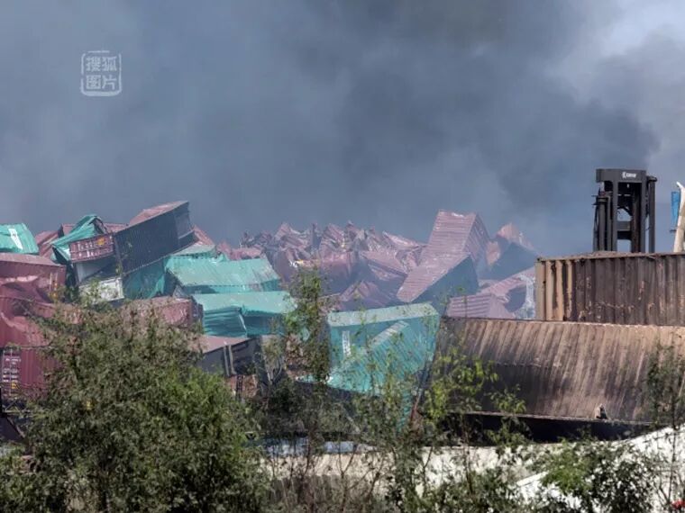距第一次爆炸點(diǎn)西北方向約20米處,有多個(gè)裝有硝酸銨、硝酸鉀、硝酸鈣、甲醇鈉、金屬鎂、金屬鈣、硅鈣、硫化鈉等氧化劑、易燃固體和腐蝕品的集裝箱。受到南側(cè)集裝箱火焰蔓延作用以及第一次爆炸沖擊波影響,23時(shí)34分37秒發(fā)生了第二次更劇烈的爆炸。