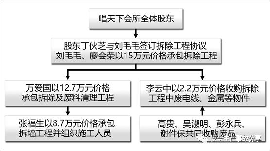 1.改建裝修工程承包情況。2016年12月,唱天下會所決定加盟使用“唯尚(V-SONG)”品牌[①]并進(jìn)行改建裝修。2017年1月5日,唱天下會所股東丁伙芝與江西聚合文化發(fā)展有限公司[②]股東杜波分別簽訂“品牌許可使用合同書”、“KTV前期籌劃合同書”、“KTV項目委托管理合同書”及“裝修設(shè)計合同”,約定唱天下會所必須按“唯尚(V-SONG)”品牌的裝修風(fēng)格進(jìn)行標(biāo)準(zhǔn)化裝修,裝修設(shè)計費(fèi)用30萬元(唱天下會所已預(yù)付10萬元)。同年2月15日,唱天下會所會議確定由股東丁伙芝負(fù)責(zé)財務(wù)及改建裝修工程相關(guān)協(xié)調(diào)事項,股東丁輝輝、田歡歡、涂宇亮負(fù)責(zé)改建裝修工程行政審批相關(guān)事項。同時在丁光榮[③]的極力推薦和勸說下,唱天下會所確定將改建裝修工程中的拆除工程由劉毛毛、廖會榮[④]以15萬元價格承包,并簽訂“KTV拆除協(xié)議”,約定將唱天下會所拆除至原始框架結(jié)構(gòu)。