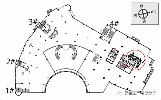 (2)2層?;馂?zāi)發(fā)生時,唱天下會所2層正在作業(yè)的施工人員共22人。聽到呼喊后,6人從1號樓梯間逃生,5人從4號樓梯間逃生,1人從弧形樓梯逃生,1人通過西北側(cè)外窗挑檐逃生,2人擊破東側(cè)外窗玻璃跳樓逃生,其余7人死亡(人員位置見圖2.1,死亡位置見圖2.2)。