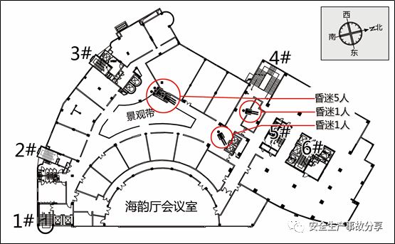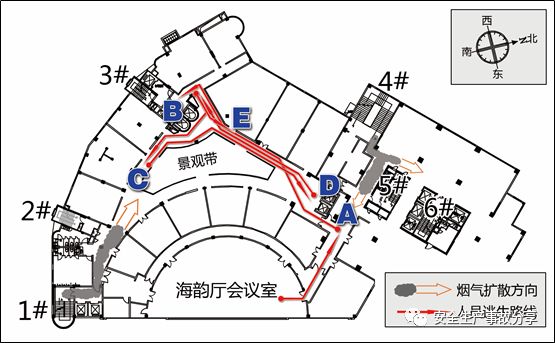 (4)4層。事發(fā)當(dāng)日,4層海韻廳會議室被江西一佳智匯管理咨詢有限公司[12]租用并組織培訓(xùn)活動。火災(zāi)發(fā)生時培訓(xùn)未開始,會議室內(nèi)共有8人。被電話告知1層著火后,其中7人隨即由會議室北側(cè)門離開,按圖2.3所示,以A→B→C→D→B→E的路線試圖逃生,但均未成功逃生并相繼昏迷倒地。后被消防員搜救送往醫(yī)院搶救,其中3人經(jīng)搶救無效死亡,4人受傷。