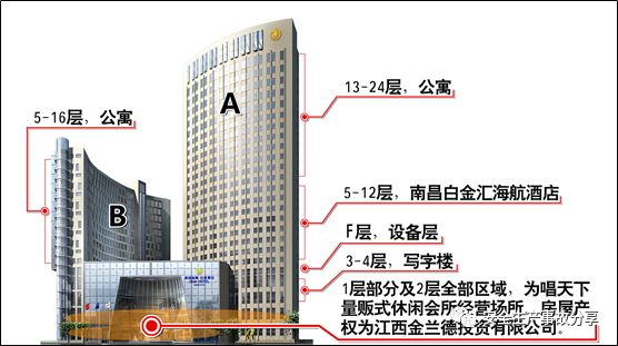 A塔樓:5-12層為南昌白金匯海航酒店經(jīng)營區(qū),13-24層為公寓;