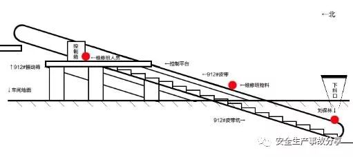 事故發(fā)生在明拓集團(tuán)鉻業(yè)科技有限公司一期高碳鉻鐵項(xiàng)目包裝車間。該車間負(fù)責(zé)產(chǎn)品的破碎及包裝工作。高碳鉻鐵出爐后經(jīng)自然冷卻,由自卸車運(yùn)輸至該車間1#破碎機(jī)進(jìn)行初破,經(jīng)1#破碎機(jī)911#皮帶(由西向東)輸送至911#振動篩,經(jīng)篩分后進(jìn)入2#破碎機(jī)進(jìn)行二破,后由2#破碎機(jī)912#皮帶(由南向北)輸送至912#振動篩,篩分成不同粒度進(jìn)行包裝、發(fā)運(yùn)。包裝車間內(nèi)設(shè)置視頻監(jiān)控?cái)z像頭4個(gè),視頻數(shù)據(jù)傳輸進(jìn)入包裝車間控制室,控制室另有1臺控制電腦,遠(yuǎn)程控制現(xiàn)場皮帶輸送機(jī)啟停。皮帶輸送機(jī)控制方式除遠(yuǎn)程控制外,還可現(xiàn)場就地控制。事故發(fā)生時(shí)正處于系統(tǒng)停機(jī),912#振動篩準(zhǔn)備檢修。912#振動篩就地開關(guān)與912#皮帶輸送機(jī)就地開關(guān)位于912#振動篩西南側(cè)912#皮帶旁,開關(guān)箱上有明顯的標(biāo)識用于區(qū)分。事發(fā)地點(diǎn)912#皮帶尾輪周圍設(shè)置有皮帶側(cè)擋板,擋板底部距皮帶約100mm高,側(cè)擋板尾部設(shè)置有擋料板一塊,4角由4道螺絲固定于側(cè)擋板尾部。擋料板下邊距皮帶約10mm寬,位置距離下料口約600mm,尾輪距離擋料板位置約1500mm。912#皮帶還設(shè)置有拉繩急停開關(guān)等安全裝置,且安全設(shè)施處于完好狀態(tài)。