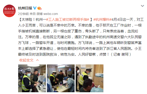 2020年4月4日,杭州一工人小王在施工作業(yè)時(shí),一根手指被機(jī)械直接割斷,另一根也受了重傷,骨頭斷了,只有表皮連著,血流如注。最終,小王被及時(shí)送到醫(yī)院救治,情況也有所好轉(zhuǎn)。